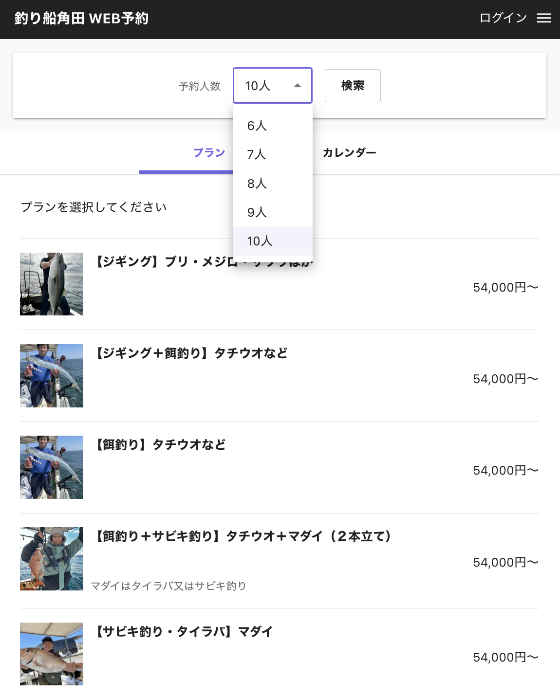 ホームページ予約状況カレンダーから釣りものメニュープランの予約の方法を説明しています