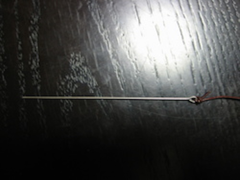 ④餌を刺す針、先を削って尖らせてある硬質ステンレスまたはピアノ線にテトロンを結びつけているところです。