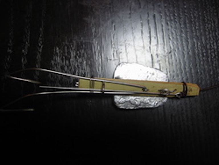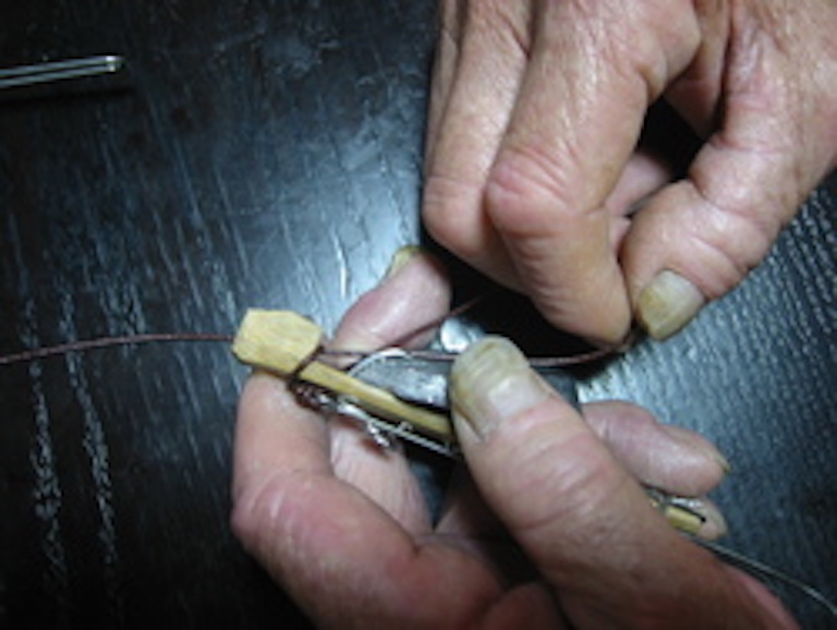 ①まず、竹に1mm程度の穴を明けてあるところに、軟質ステンレスで錘を止める。