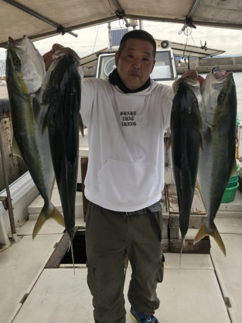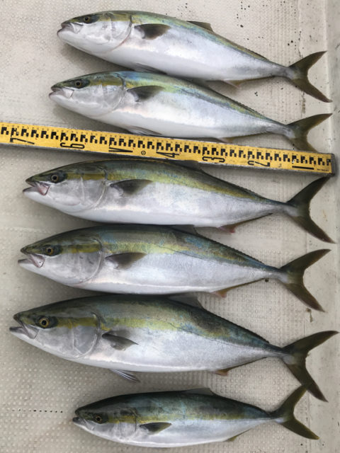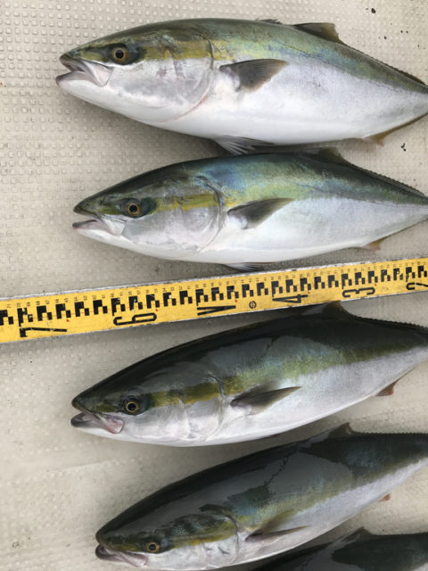 朝一番のポイントで1匹のバラシはありましたが、メジロ5匹上げたところで、餌切れしてしまい再度、餌釣りしなおしてから、反転の潮でハマチを1匹追加で終了しました。