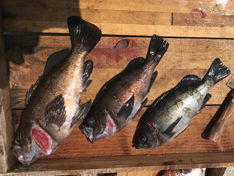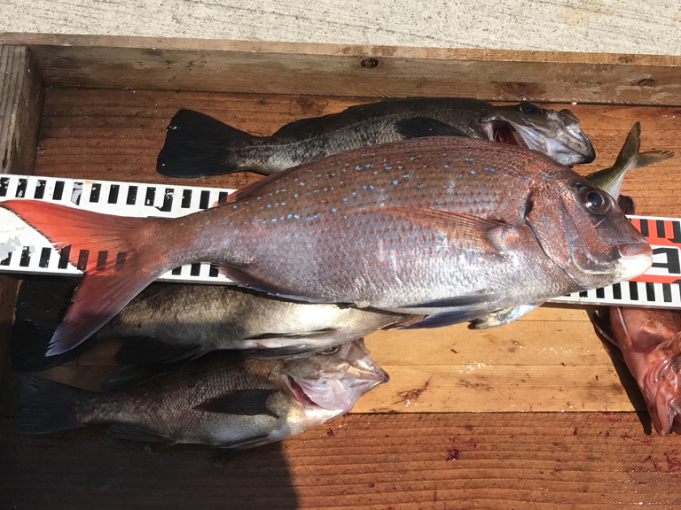 【魚種】マダイ:38cmを1匹、メバル:30cmを頭に6匹、その他アジとガシラ