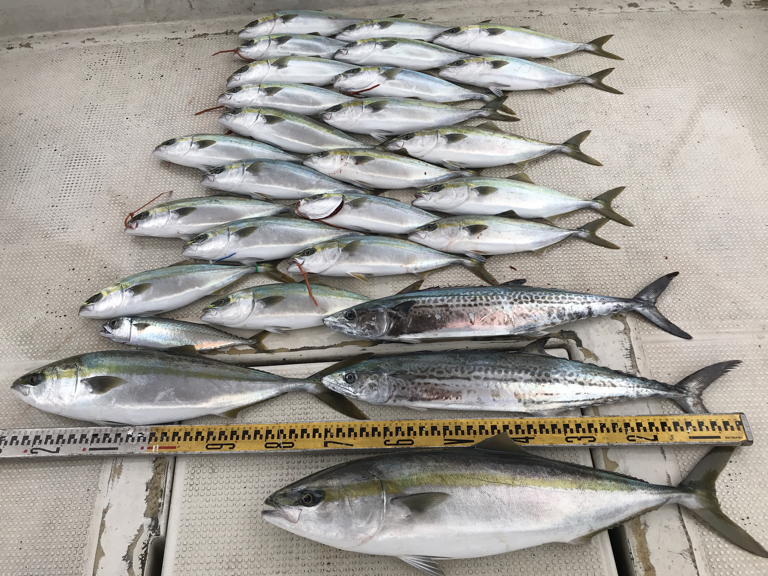 【コメント】田中様仕立て5名様ジギングで出船、本日も全員に釣れました竿頭はブリとメジロにハマチで、その他サワラ・ハマチ・マサバなど釣れました。