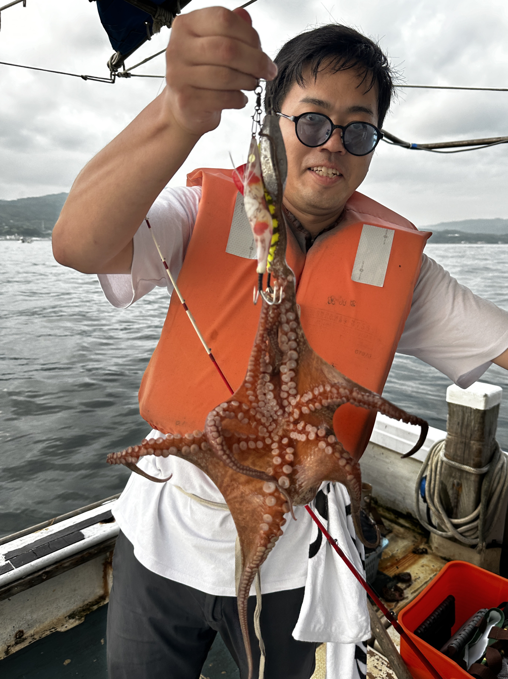 【コメント】 本日はオレンジ色の似合うメンバー10名様のマダコ釣りで出船。