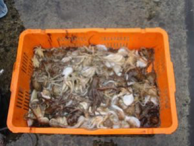 スマリに錘が付いたテンヤで蛸テンヤといいます。これにイイダコが乗ってくるので掛けて釣る釣りです。120gぐらいのイイダコがテンヤに乗るとさお先に重みを感じますので、そのときに合わせて巻き上げるだけの釣りです。でもこれが、結構釣れるので面白くまた、気の合うメンバーで仕立てているとわざと蛸が墨を吐くので、面白がってワイワイいいながら釣られています。